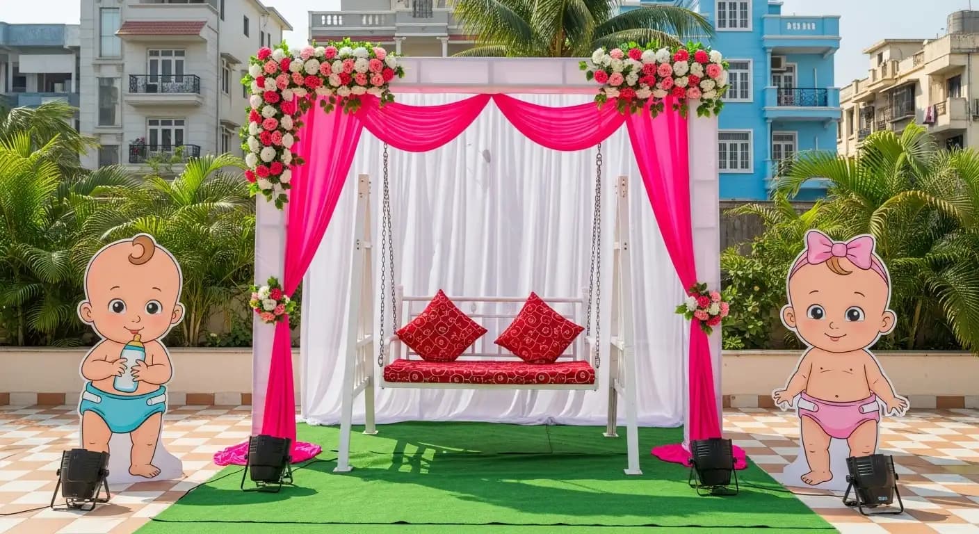 Create a serene atmosphere with a jhula (swing) as the attraction. Whether you hang it from a tree or indoors, adorning it with flowers and twinkling fairy lights will create a dreamy and enchanting look for the Jhula Baby Shower Decoration. Hang baby socks and mittens from the jhula for a whimsical touch. Set up a cozy seating area nearby with throw blankets for a snug gathering.
