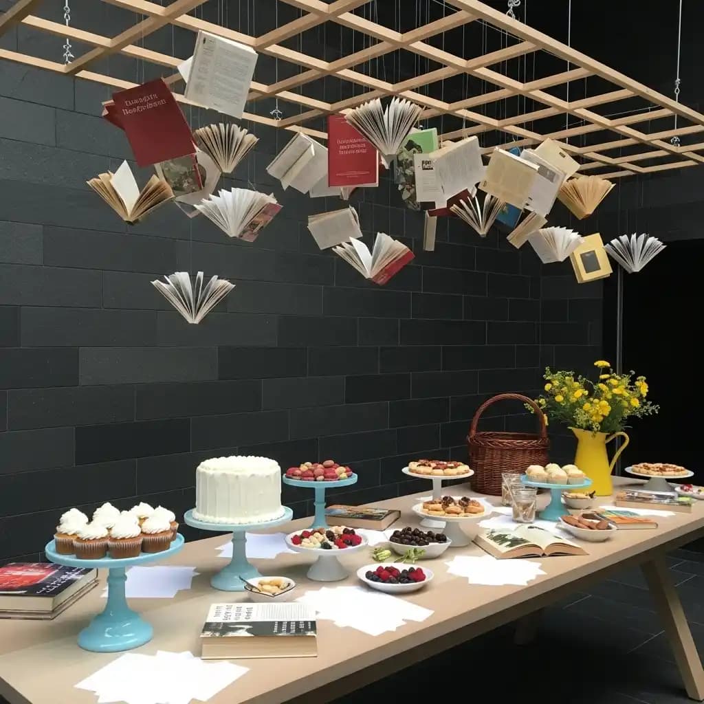 Create a special place for book lovers to learn and imagine. Make a cozy area with old books on shelves, comfortable spots to read with soft cushions, a cake table with lots of hanging books & decoration items, and a peaceful atmosphere that helps people love reading.