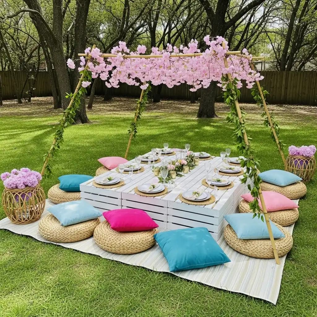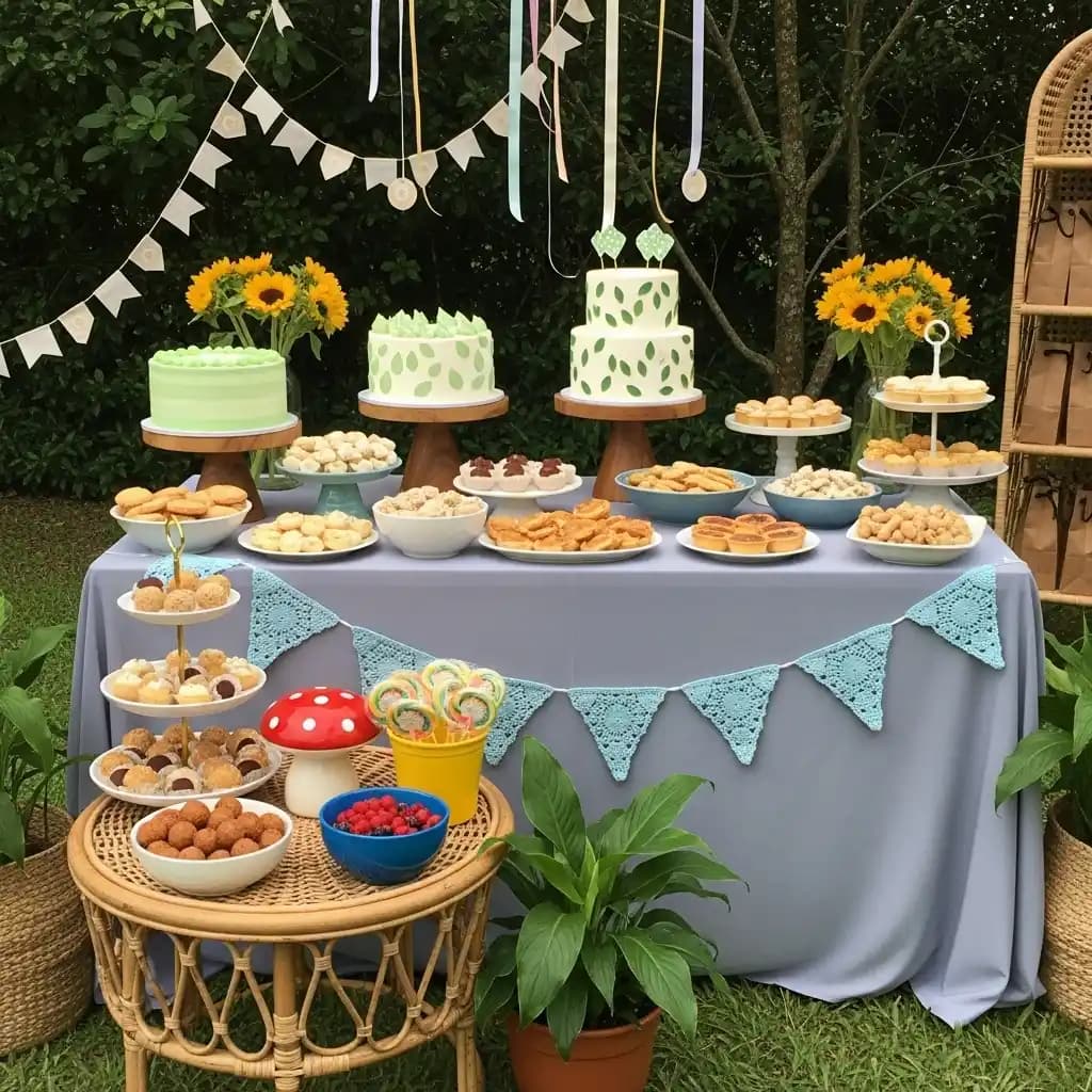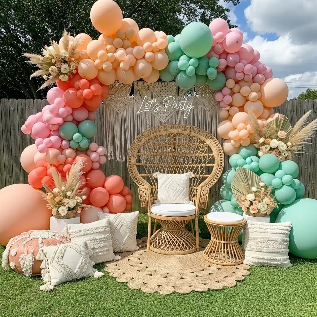 Make the celebration feel natural and beautiful by using organic decorations like plants, rough textures, and rustic details. This will help people appreciate nature and feel enchanted by the outdoors. you can use a balloon arch to make it more lively and fun.