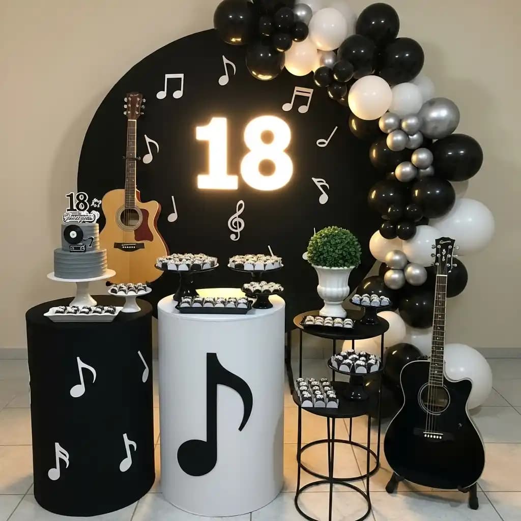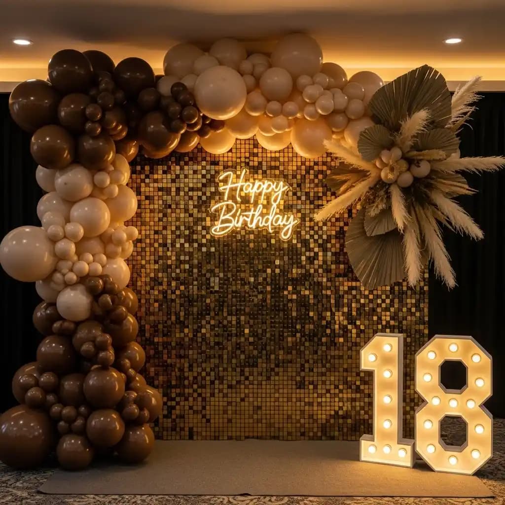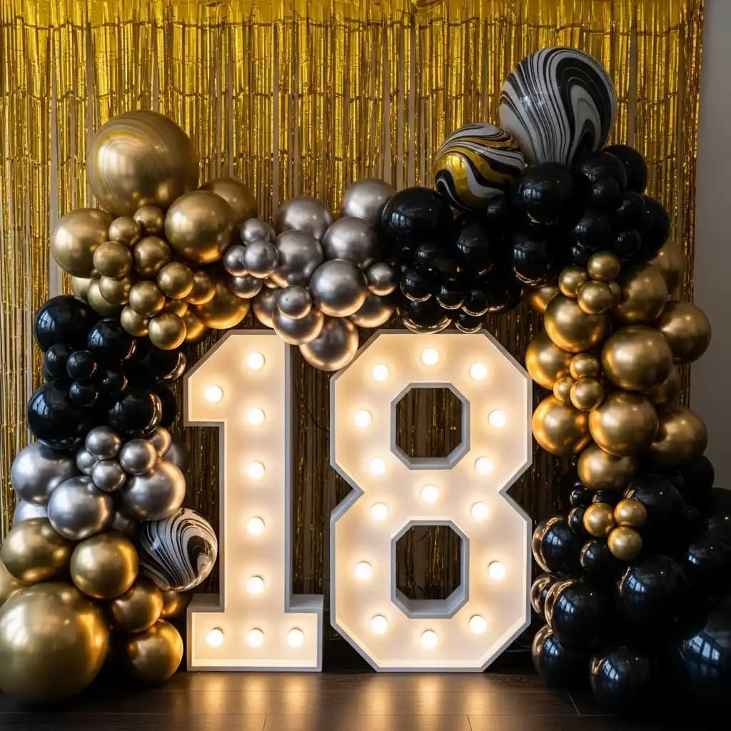 Let’s make the 18th birthday celebration extra special with a fancy black and gold theme! You can also add lots of sparkly decorations like frill curtains & shimmers to create a glamorous atmosphere, just like a fancy celebrity party. It’ll be so much fun!
