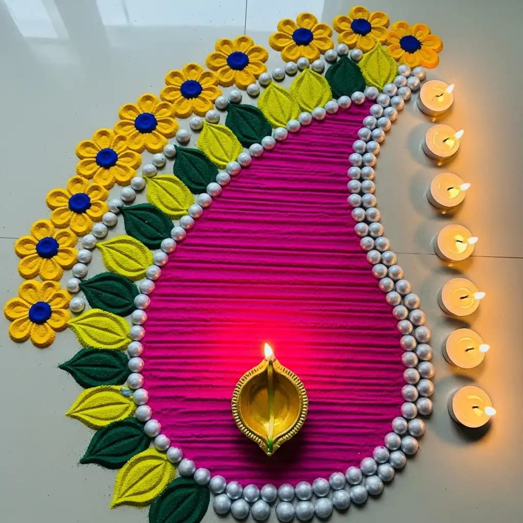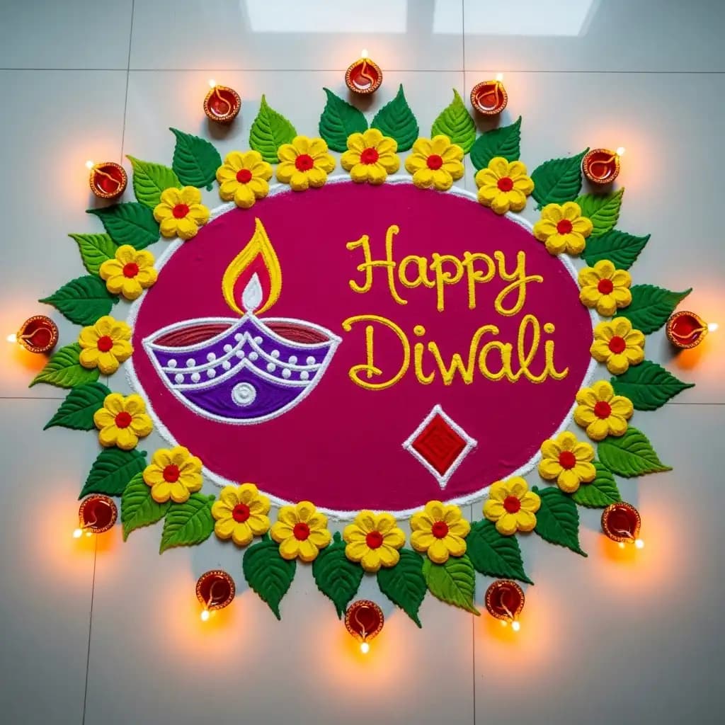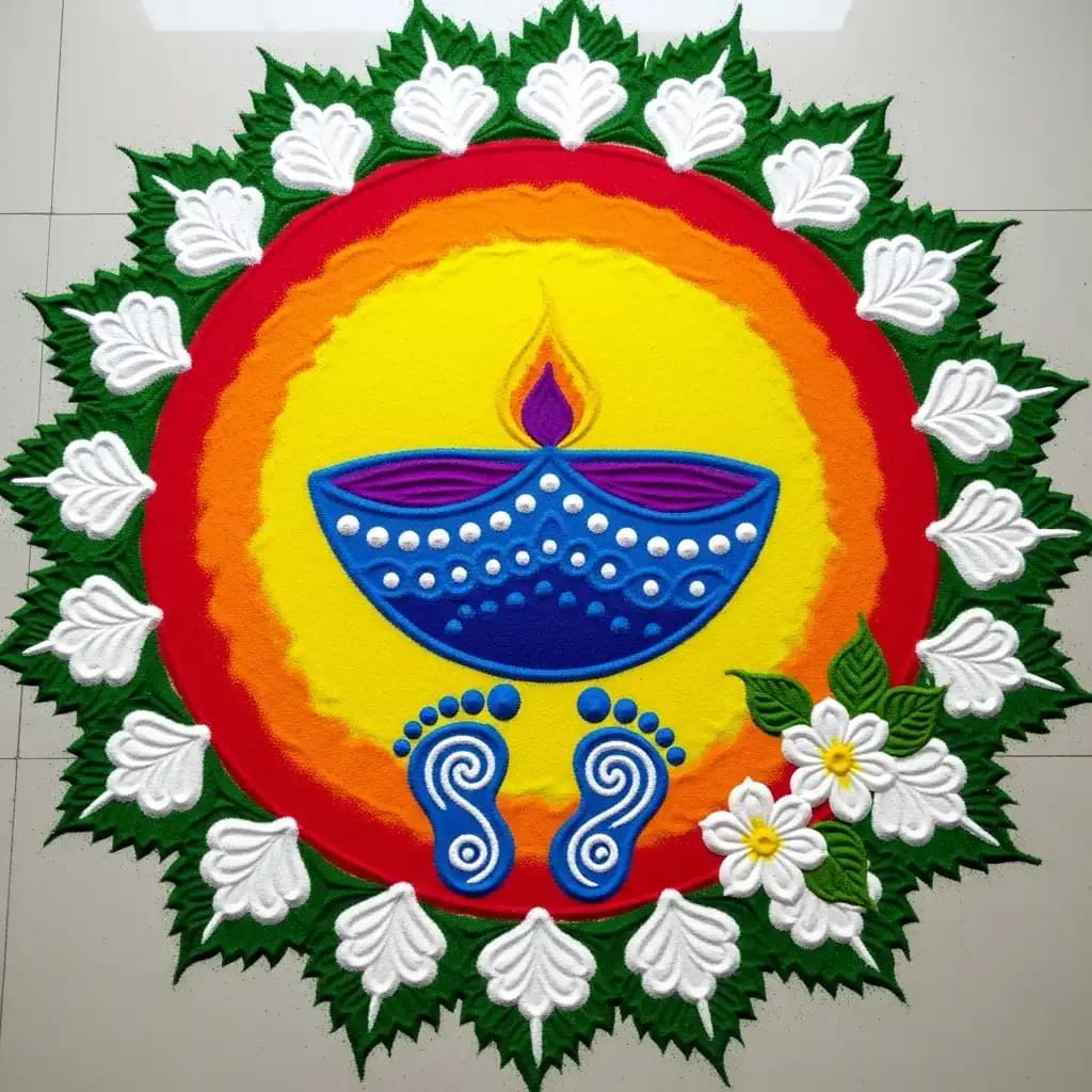 Celebrate the festival of lights with a rangoli design featuring diyas (traditional oil lamps), radiating warmth and joy.