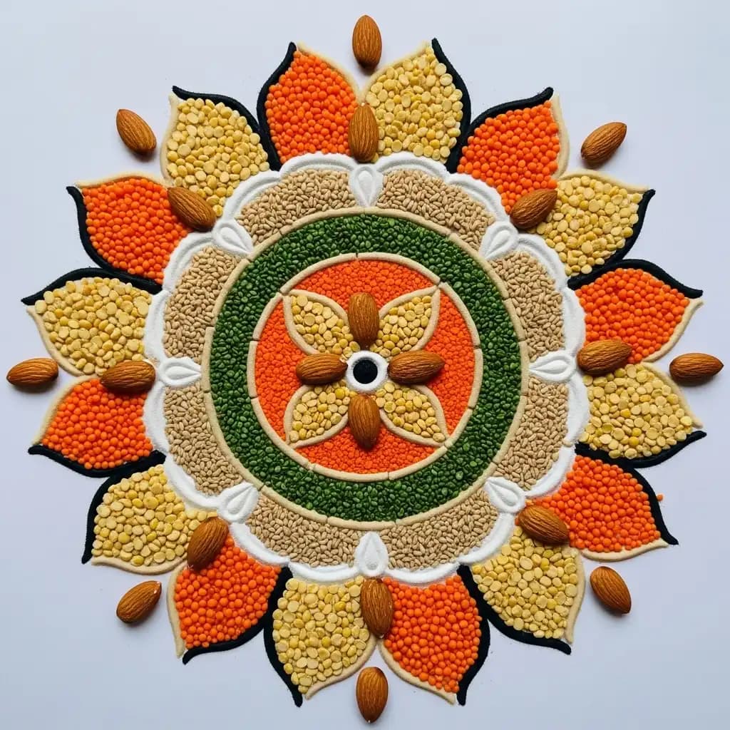 Innovate by using grains and pulses to craft rangoli designs that embrace simplicity and a connection with nature.