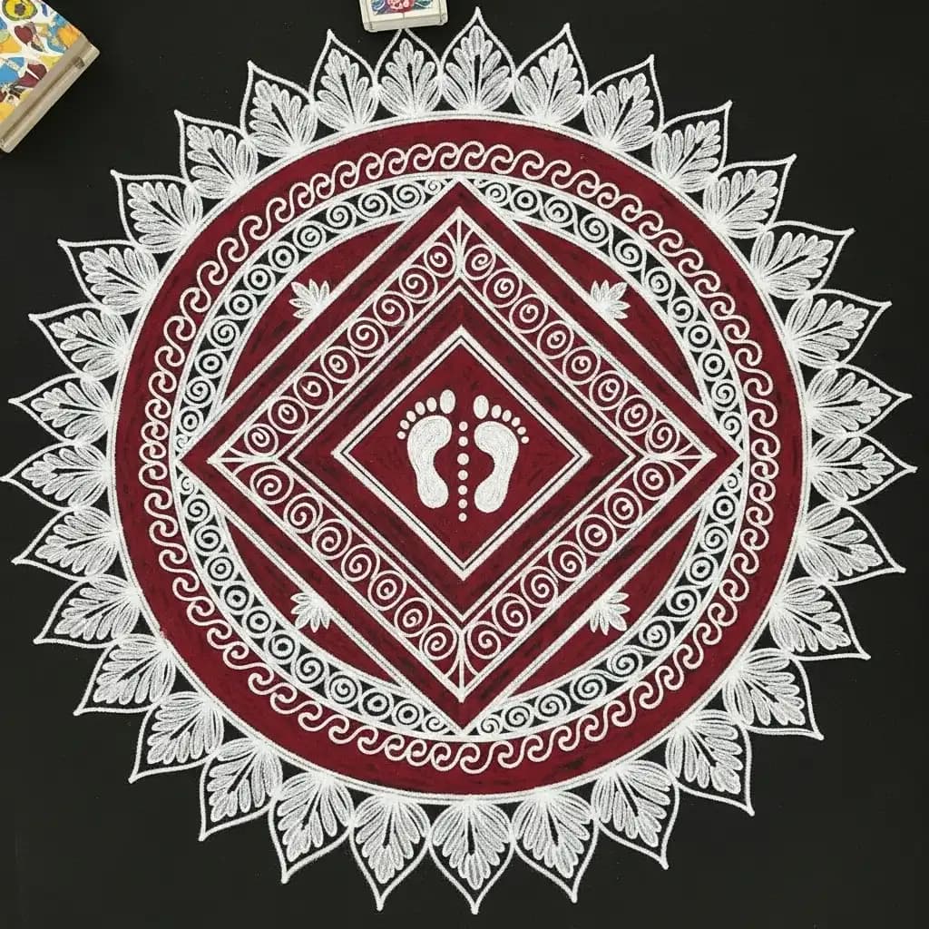Adorn your puja area with an elegant Bengali Alpana rangoli, using rice flour or colors, portraying traditional motifs that bring blessings