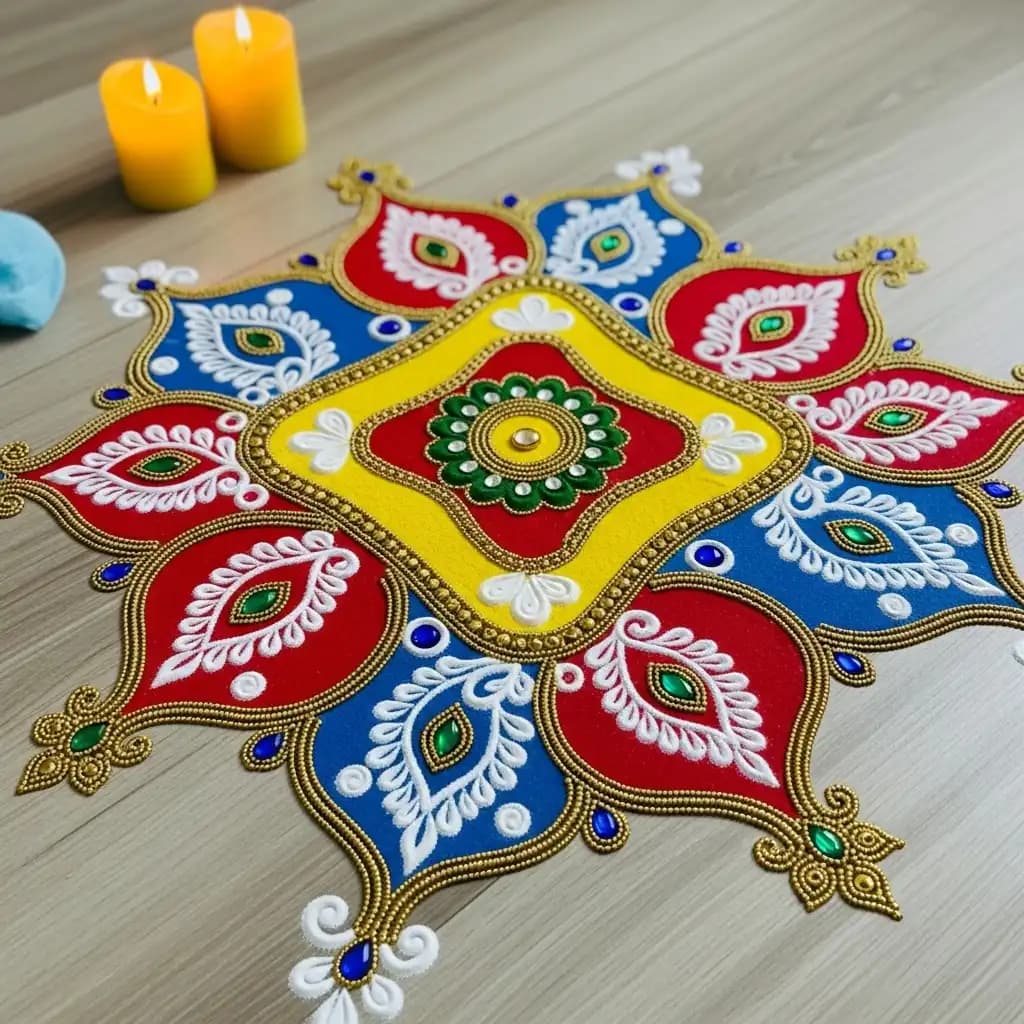 Experiment with Kundan stones to design a rangoli that adds a touch of opulence and elegance to your festive decorations.
