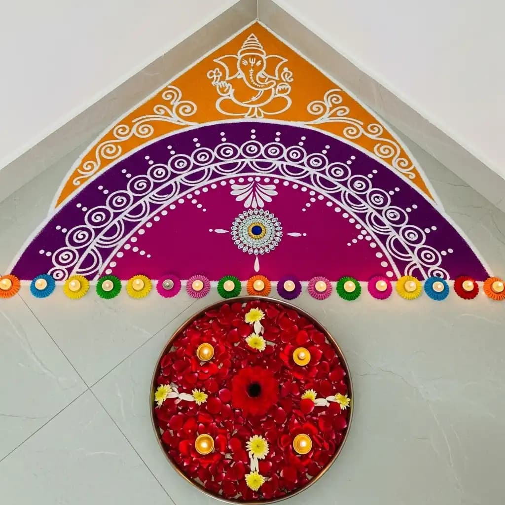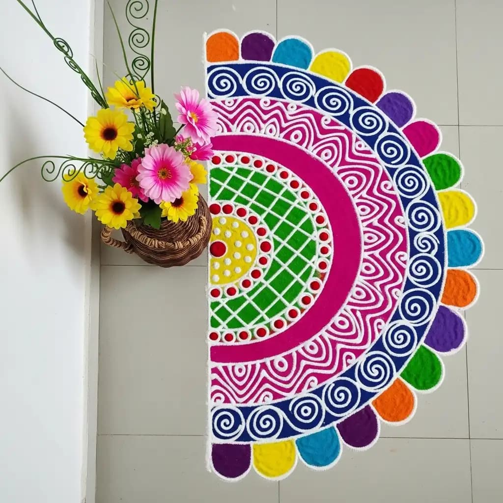 Experiment with a semi-circle rangoli design, complementing the architecture of your space and adding a unique touch.