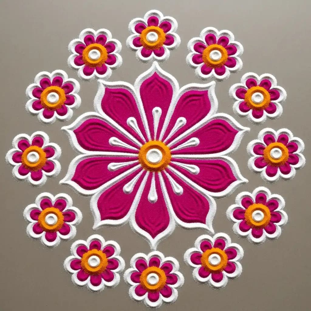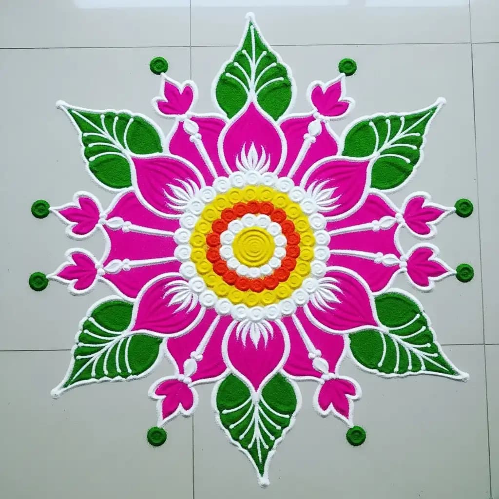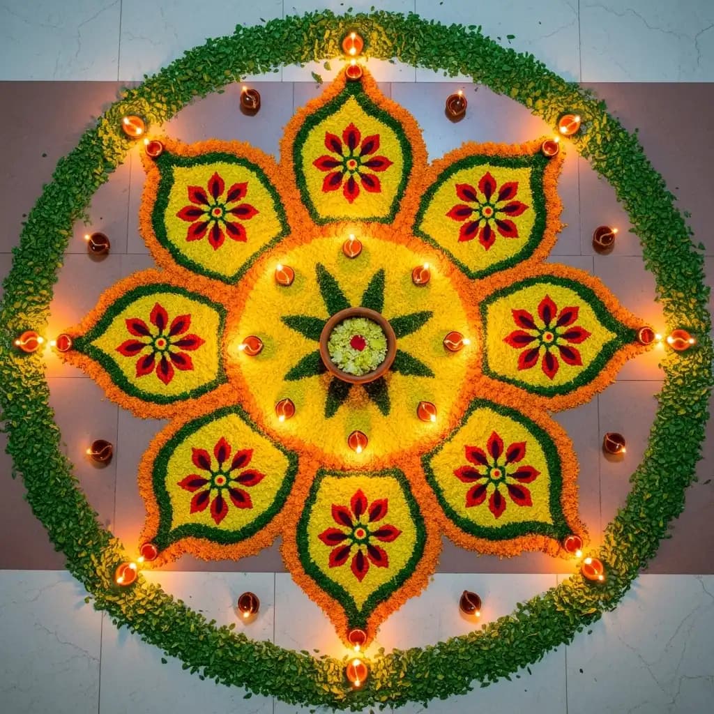 Embrace the beauty of nature with a delicate floral rangoli, featuring intricate flower patterns that spread fragrance and positivity.