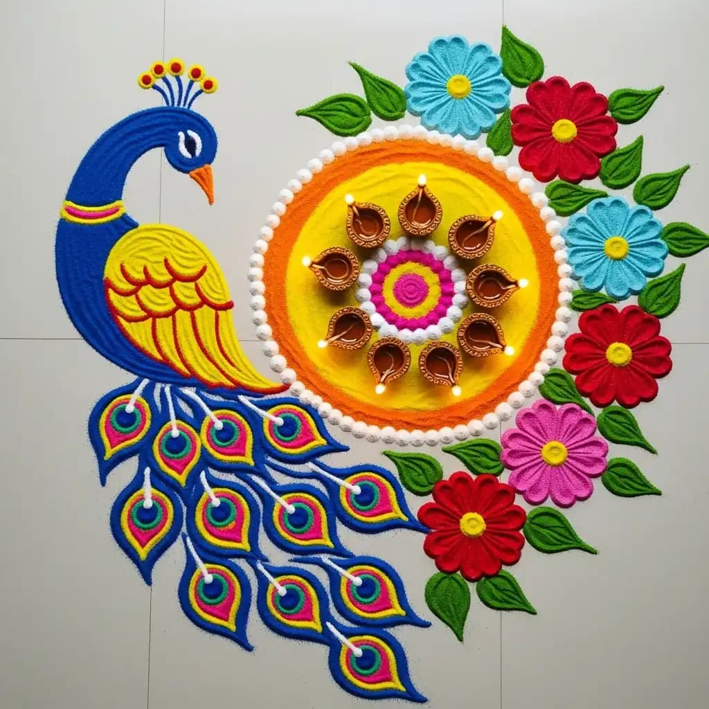Craft a mesmerizing rangoli resembling a peacock in all its splendor, showcasing the bird's feathers, grace, and vibrant hues.