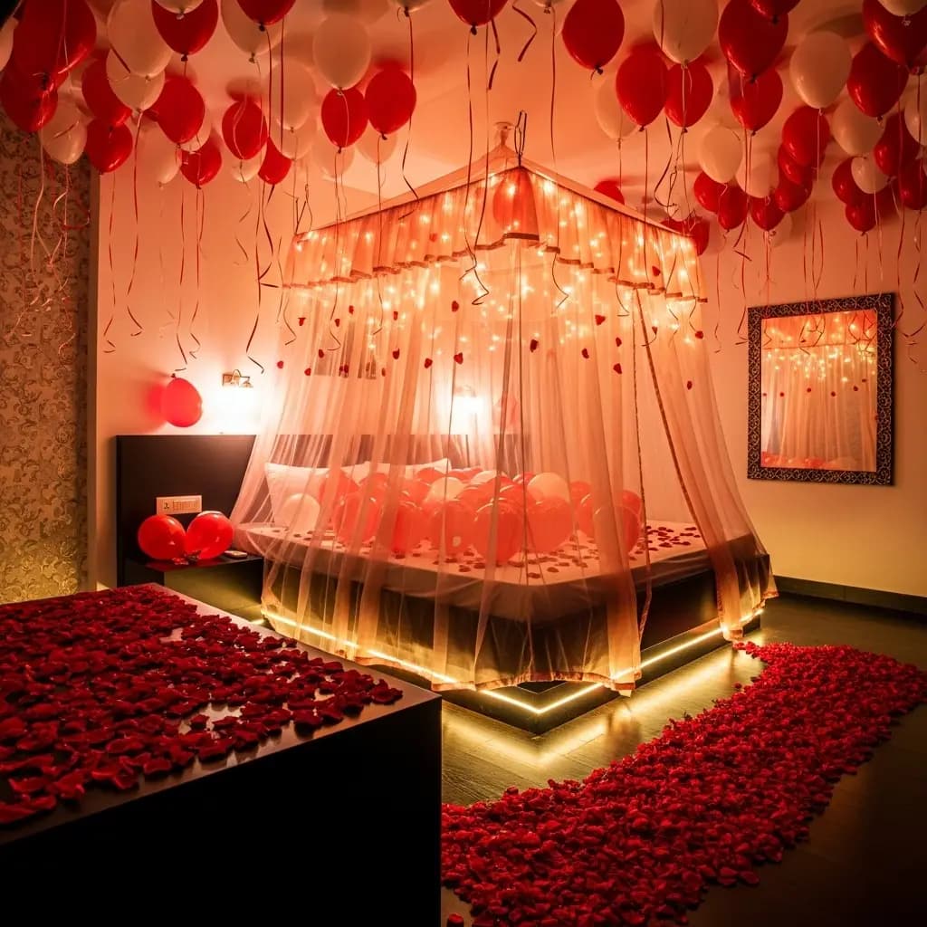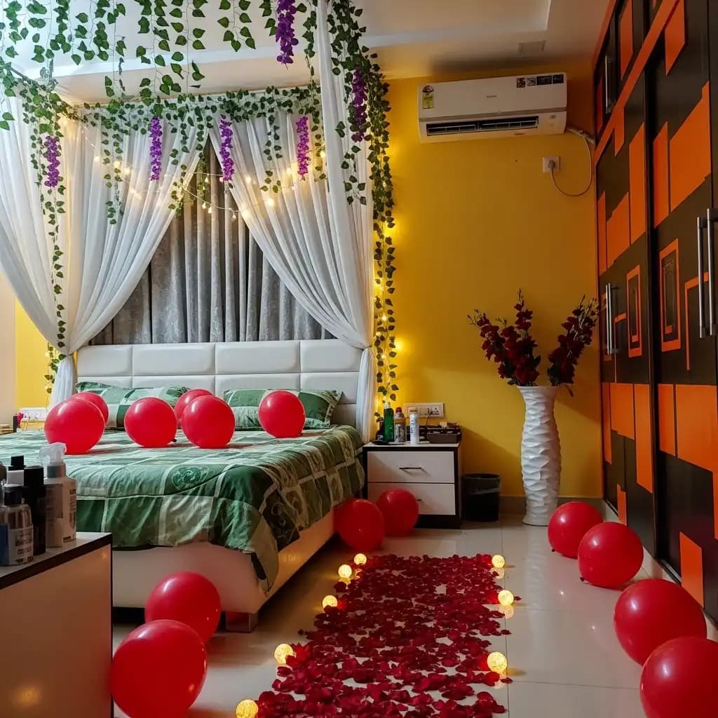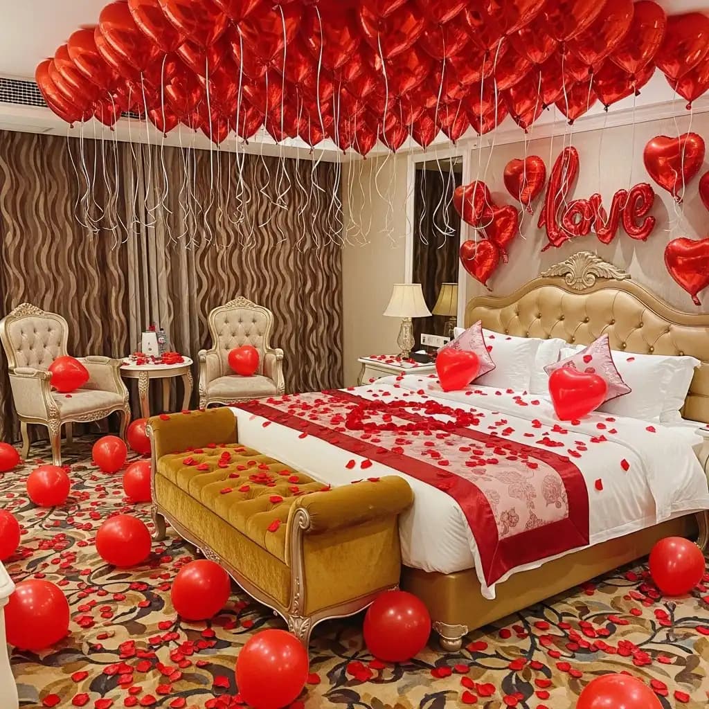 Balloons add a whimsical touch to the First Night Room Decoration. You can use color-themed balloons or custom balloons with the couple's names. A balloon-filled ceiling or a balloon pathway leading to the bed creates a dreamy atmosphere.