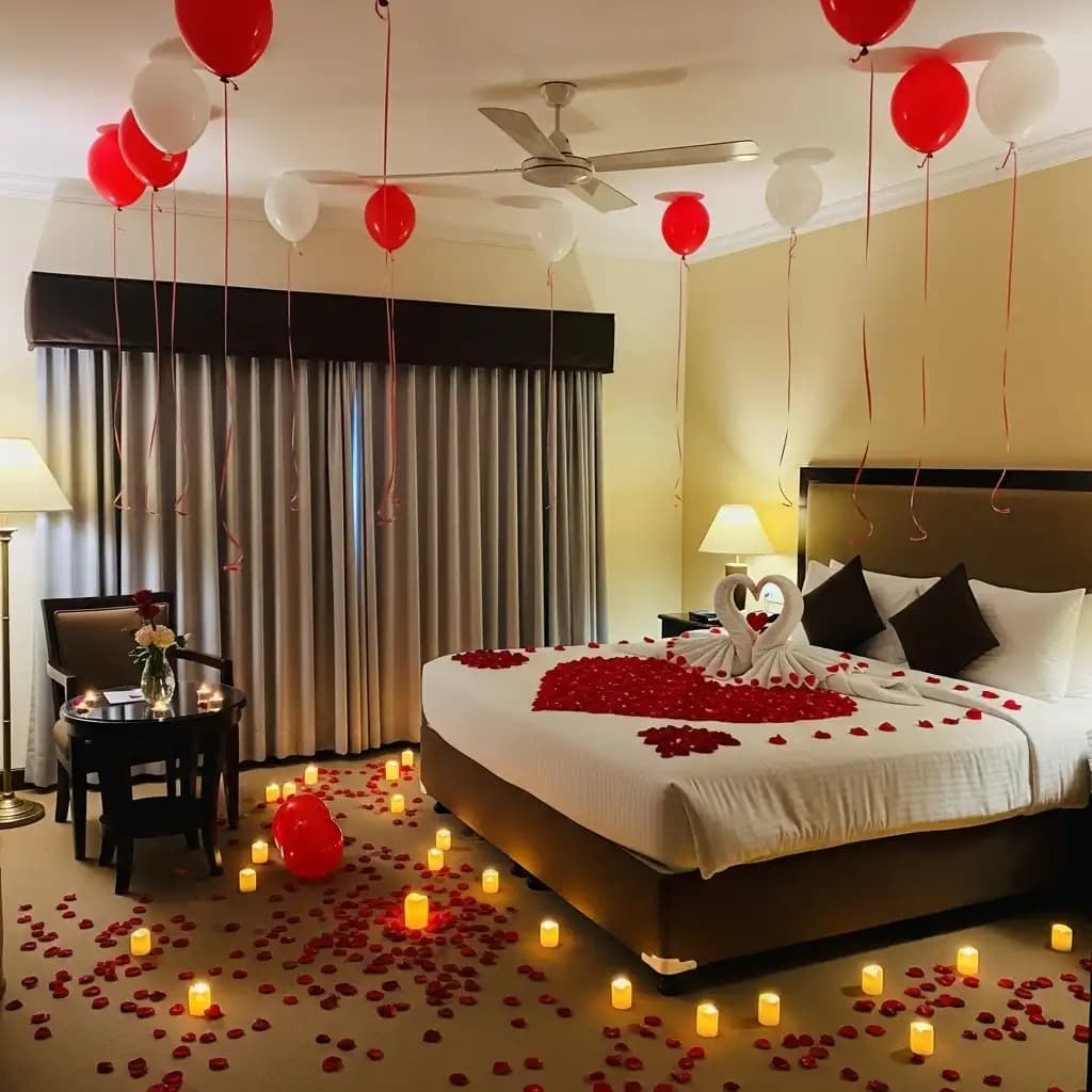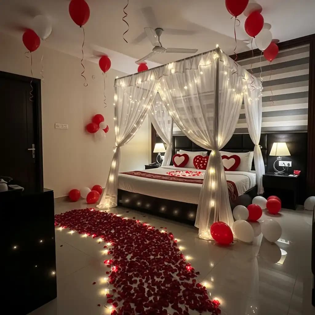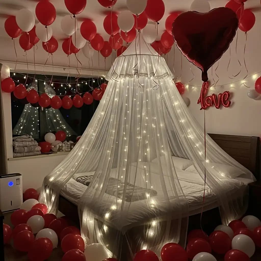 Balloons add a whimsical touch to the First Night Room Decoration. You can use color-themed balloons or custom balloons with the couple's names. A balloon-filled ceiling or a balloon pathway leading to the bed creates a dreamy atmosphere.