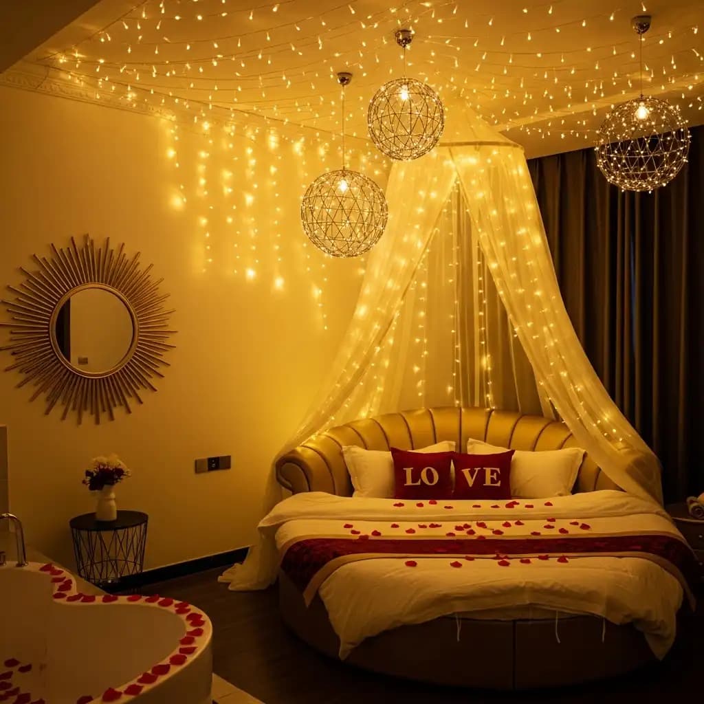 Fairy lights create a magical and enchanting atmosphere. Hang them on the walls, wrap them around bedposts, or drape them across the room to infuse a romantic glow.