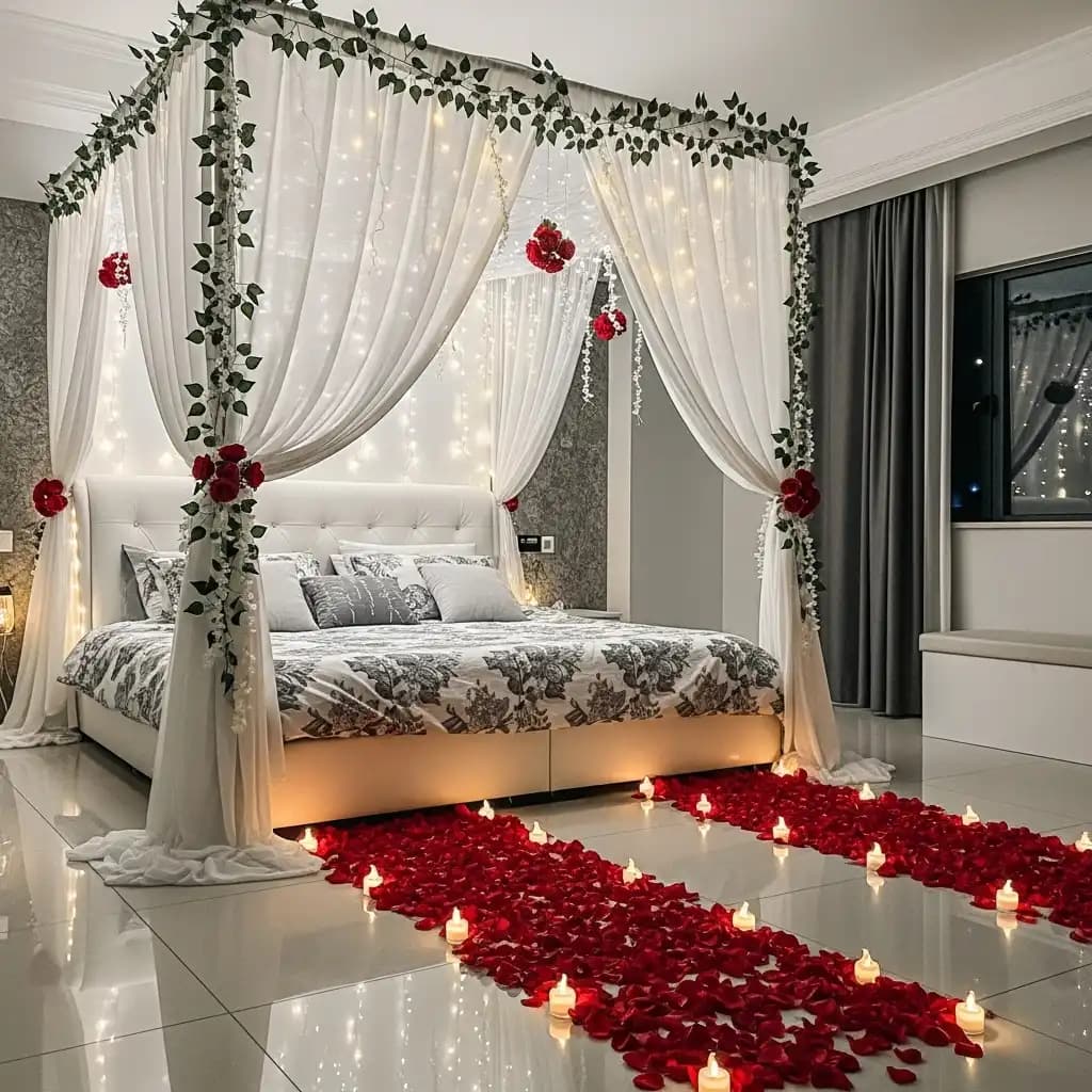 Design a trail of rose petals leading from the entrance to the bed. This creates a romantic path for the couple and enhances the anticipation of the night.
